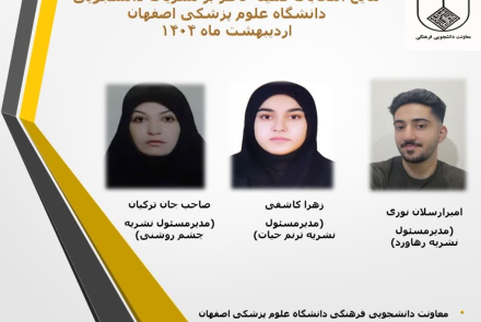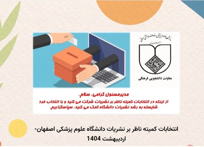 انتخابات کمیته ناظر بر نشریات دانشجویی دانشگاه علوم پزشکی اصفهان روز چهارشنبه مورخ 10/02/1404برگزار شد، در این دوره از انتخابات که با مشارکت فعال مدیران مسئول بر نشریات دانشگاه همراه بود، آقای امیرارسلان نوری(مدیر مسئول نشریه رهاورد) و خانم ها زهرا کاشفی(مدیرمسئول نشریه ترنم حیات) و صاحب جان ترکیان(مدیر مسئول نشریه چشم روشنی) حائز اکثریت آرا شدند و به کمیته ناظر بر نشریات دانشجویی دانشگاه راه یافتند. نمایندگان منتخب مدیران مسئول نشریات دانشجویی، به مدت یک سال به عنوان عضو دانشجویی کمیته ناظر بر نشریات دانشگاه خواهند بود.